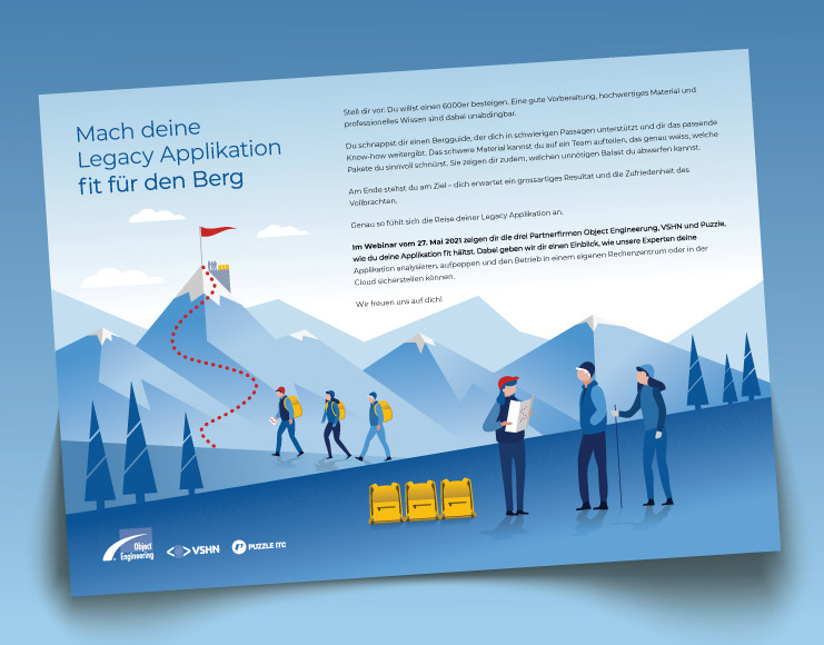 Flyer mit Illustration für den Webinar "Mach deine Applikation fit für den Berg".